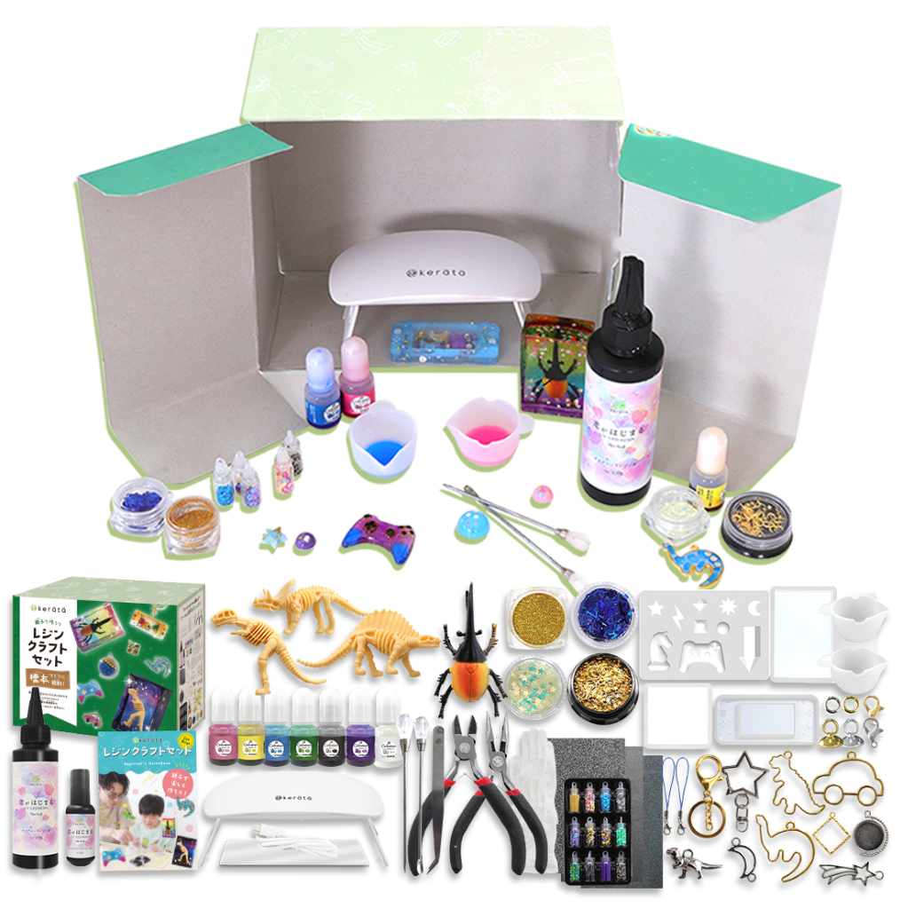 ケラッタレジンシリーズのベストセラー「スターターキット」から、男の子も楽しめるセット「スターターキットfor boys」が新発売。男の子が大好きなヘラクレスオオカブトやティラノサウルスなどのミニチュアフィギュアつきで、レジン標本を作ることができます。キラキラのパーツやモールドの組み合わせで作れるレジンは無限大。夏休みの自由研究にもぴったり!仕上がりが自慢のケラッタオリジナルレジン液と動画解説付きガイドブックも同梱し、届いてすぐに遊べます。