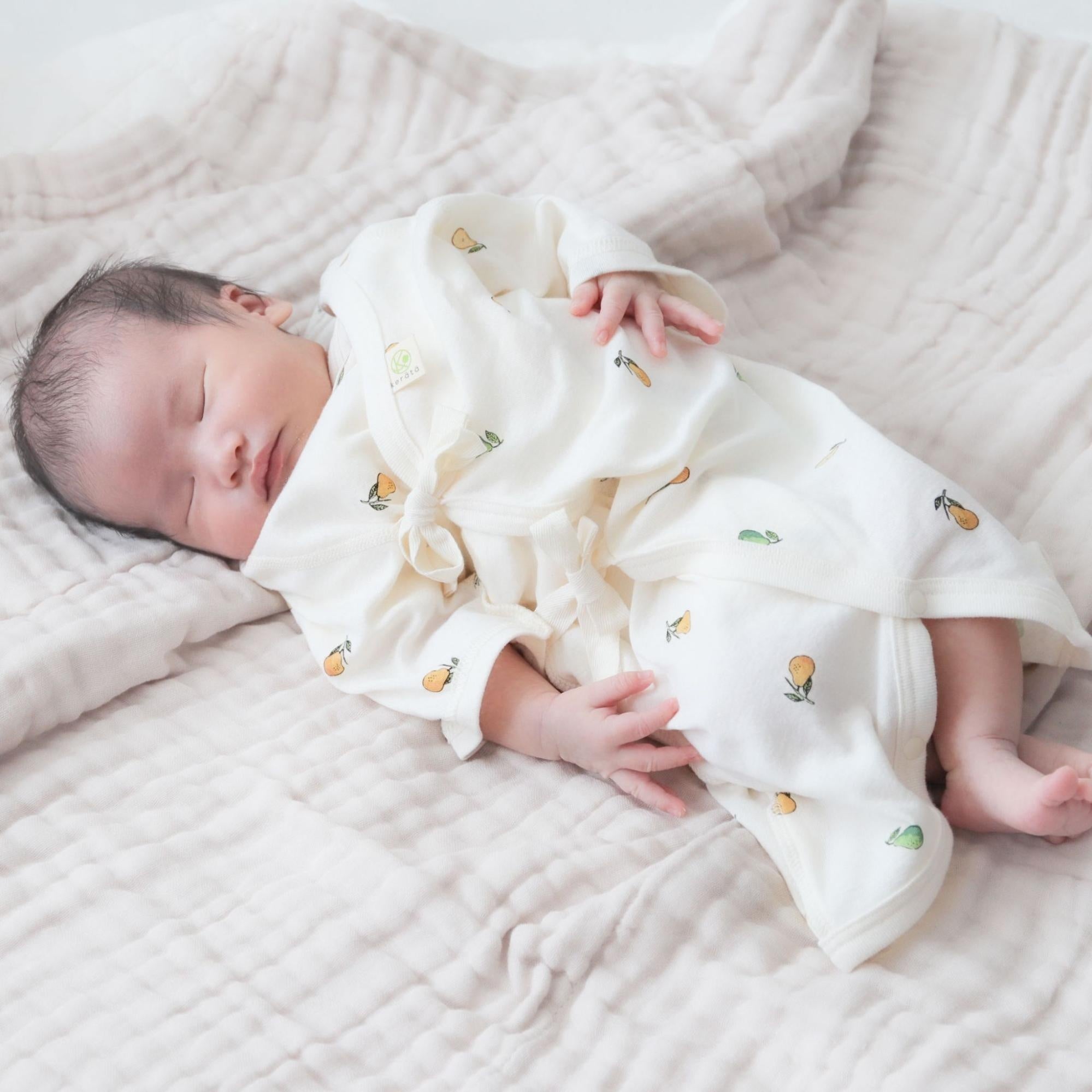 生まれたての赤ちゃんのお肌にやさしいコットン100%でできた肌着のセット。かわいいフルーツモチーフ柄をちりばめたかわいいデザインで繊細な赤ちゃんの肌をふんわりやさしく包みます。
