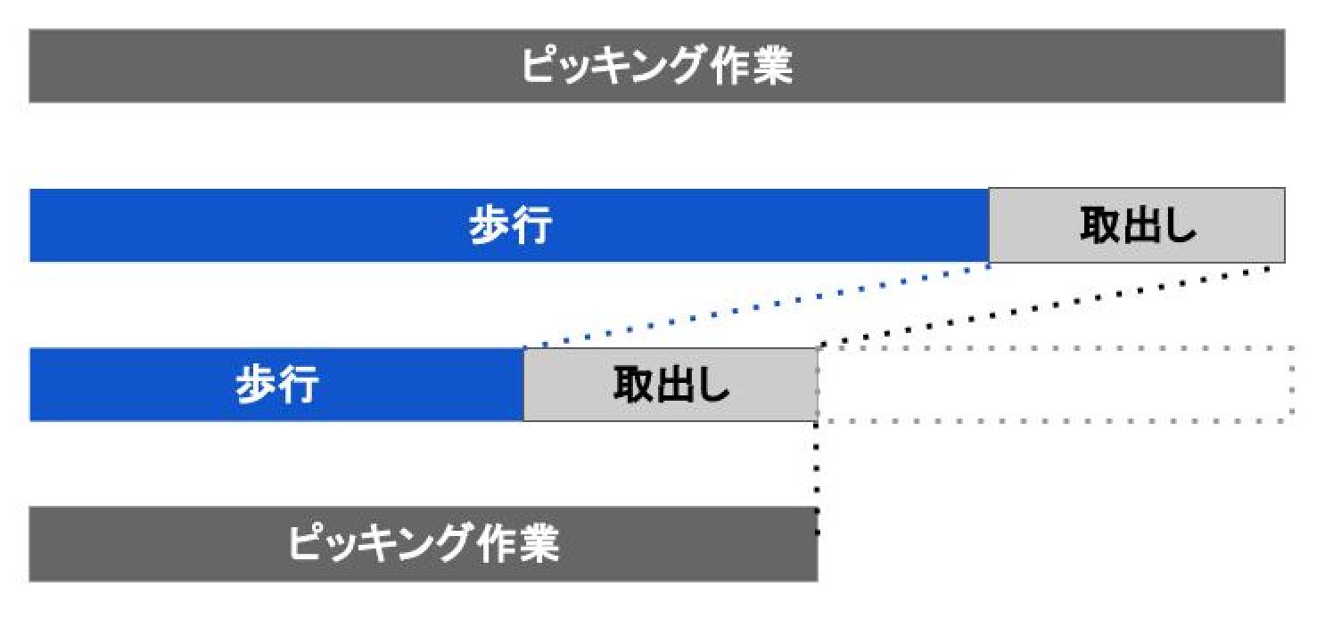 ピッキングの作業は大きく、「歩行」と「取出し」の作業によって構成されますが、そのうちの8~9割を占めている「歩行」の時間を最小化することで、ピッキング作業の最小化を実現いたします。