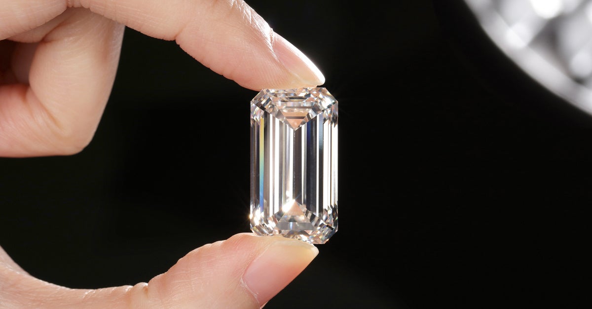 インドのEthereal Green Diamondが製作したもので、34.59カラット(24.94×13.95×9.39 mm)のエメラルドカットのラボラトリーグロウン(合成)ダイヤモンドは、VS2、Gカラーと評価されました。