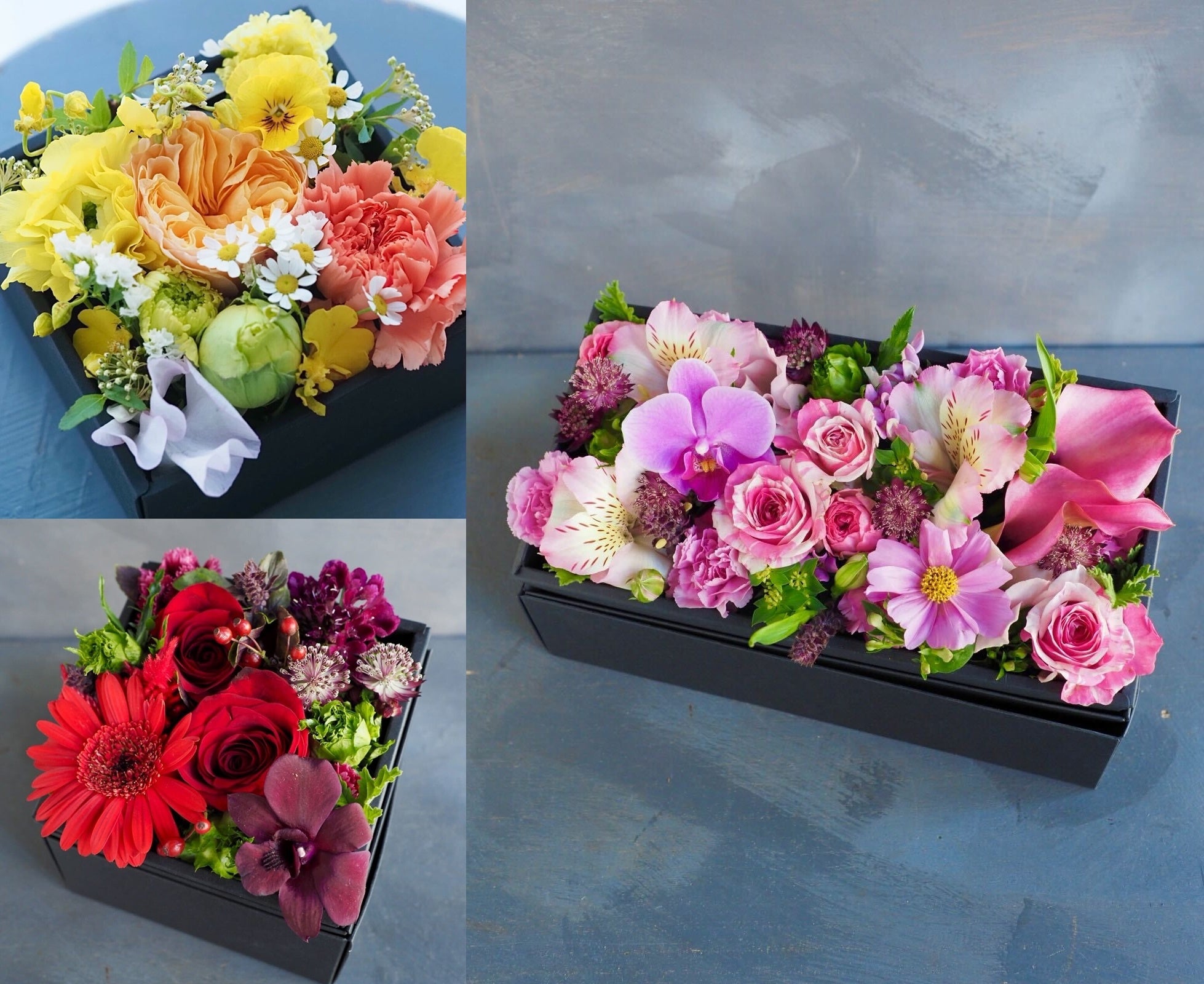 一見お花には見えない、サプライズとしてもおすすめのBOXフラワーギフトです。蓋を開けた瞬間に香りもお楽しみいただけるよう、さまざまな種類のお花とグリーンでアレンジしています。お花は蓋に立て掛けて飾れる仕様です。販売価格:Sサイズ3,000円、Mサイズ5,000円。