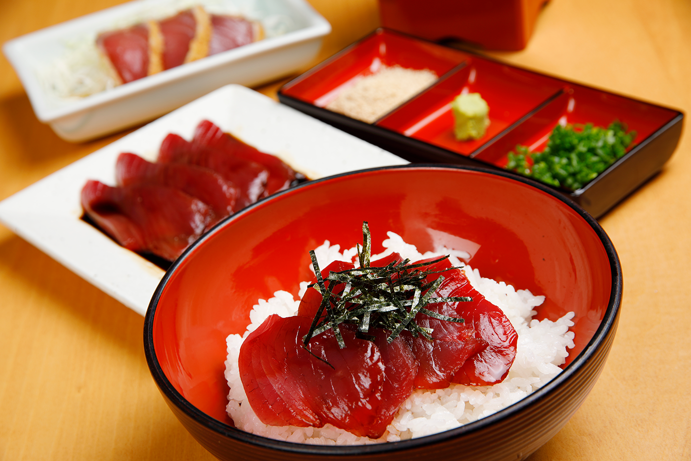 提供店それぞれが創意工夫して味付けした2種類の漬けかつおを、自分で炙って食べる新しいグルメです。 もちろん、新鮮なかつおは炙らずにそのまま食べても美味。例えば「港の駅めいつ」では、日南の漁師町ならではの「特製しょう油ダレ」と「塩ダレ」の2つの味わいが楽しめます。現在、日南市内の10店舗で提供されています。