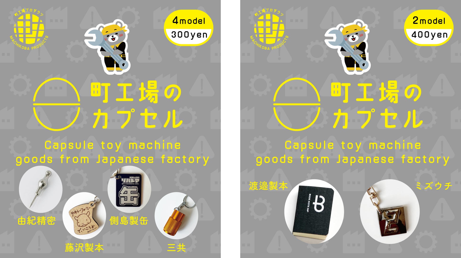 町工場での製造の過程で出る廃材や部品の一部を職人たちが丁寧に加工し仕上げた小物製品をカプセルに詰め込みました。大人も子供も楽しめる中身となっております。300/400円・6種のバリエーションでご用意しています。