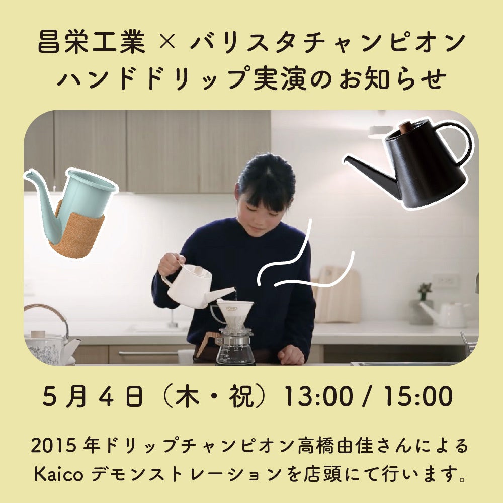 SCAJハンドドリップチャンピオン、髙橋由佳さん特別に来店。昌栄工業のロングライフデザイン製品、kaicoドリップケトルの特性を活かしたコーヒーハンドドリップ講習実演会。プロの技を間近で見学できる貴重な機会です。