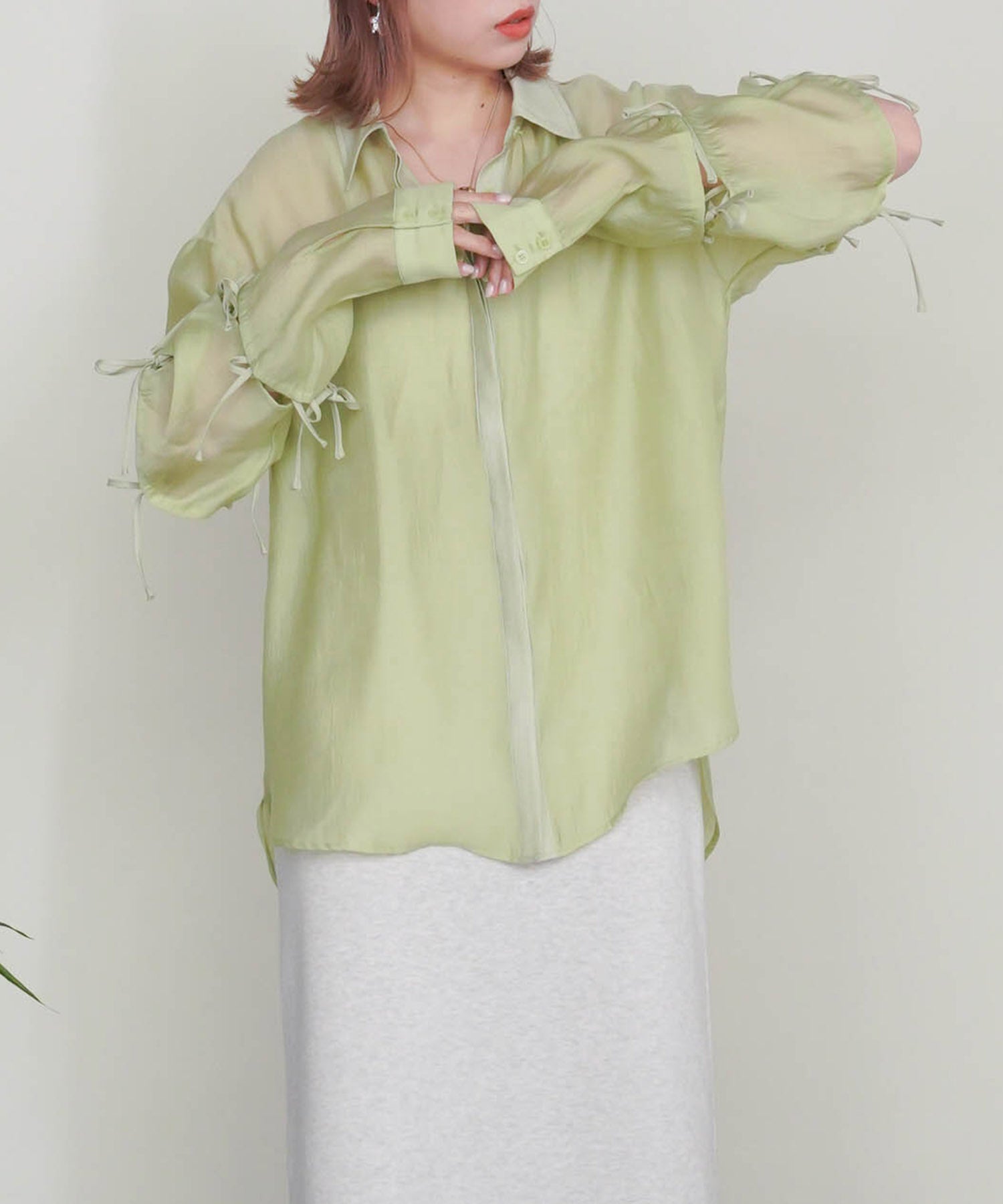 旬のシアー素材で抜け感のあるシャツ。袖のリボンをほどくと長袖から半袖に変わる2way仕様。