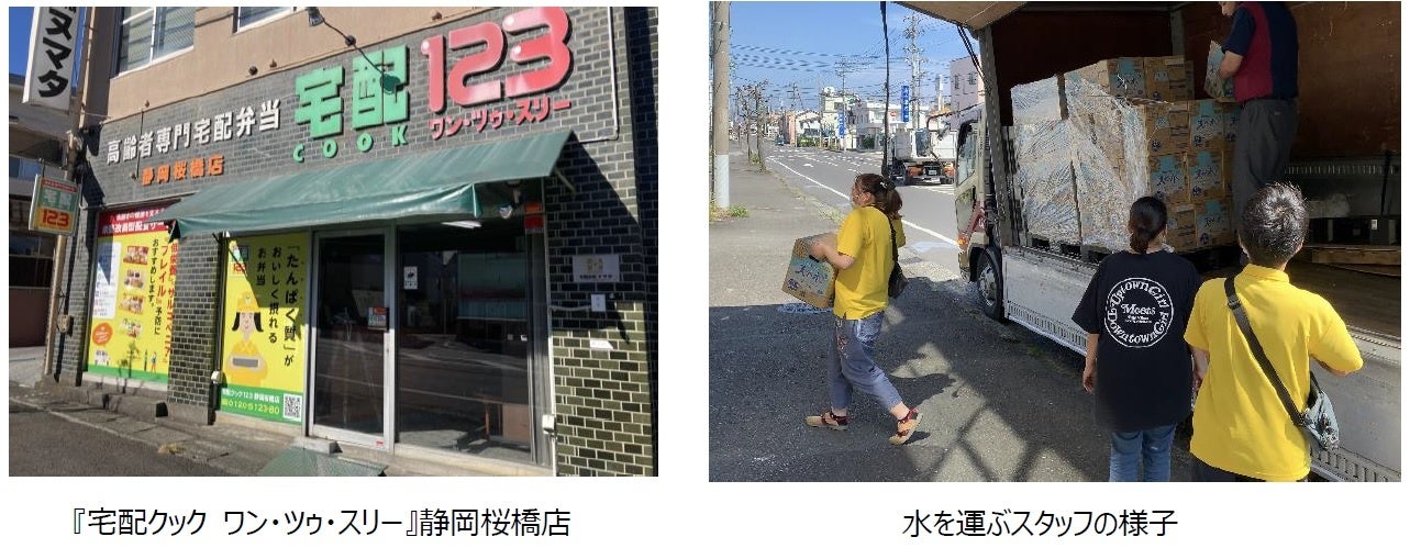 台風15号の大雨の影響により、静岡県内各地で被害が発生し、静岡市清水区では一部の地域で断水被害が現在も続いています(9月29日時点)。被害を受けた『宅配クック ワン・ツゥ・スリー』静岡桜橋店は、近隣店舗や、山奥の湧水の供給によりお弁当の調理を続け、滞りなく利用者への配達を行っています。また、27日より、給水車が来ても取りに行けない・スーパーへ買い物に行けない利用者が多くいるとして、お弁当の配達時に無料で2リットルのミネラルウォーターをお届けしています。被害によって日常と違う生活を送るなか、配達員からの声かけや、お弁当や水の配達を行うことで少しでも利用者の不安が和らぐよう、尽力してまいります。