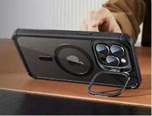 ESRのHaloLock(TM)搭載の iPhone 15 シリーズ用ケースは、最も強力な磁石(吸着力1,500g)を搭載しており、MagSafeアクセサリーを確実に吸着し、強力かつ安全に固定されます。隠れスタンドは、折りたたんだ時にカメラのフレームに隠れるように配置され、MagSafeリングを100%妨げず、安定した角度で動画等を視聴できます。iPhone 15の全てのモデル(iPhone 15 / iPhone 15 Plus / iPhone 15 Pro / iPhone 15 Pro Max)に対応したサイズを取り揃えいています。