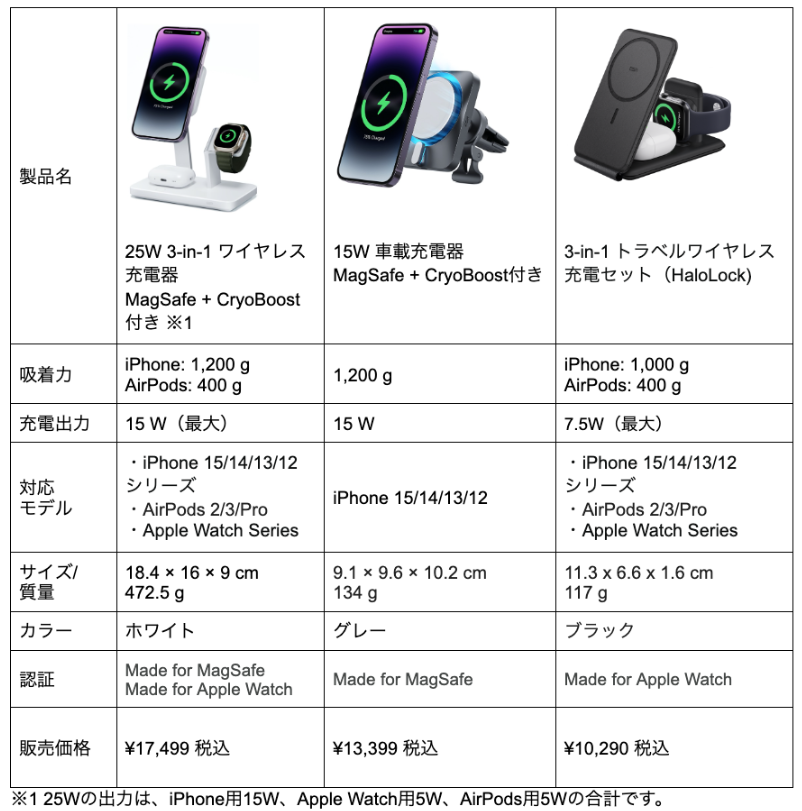 ■ iPhone 15 対応 MagSafe充電器の新製品3種