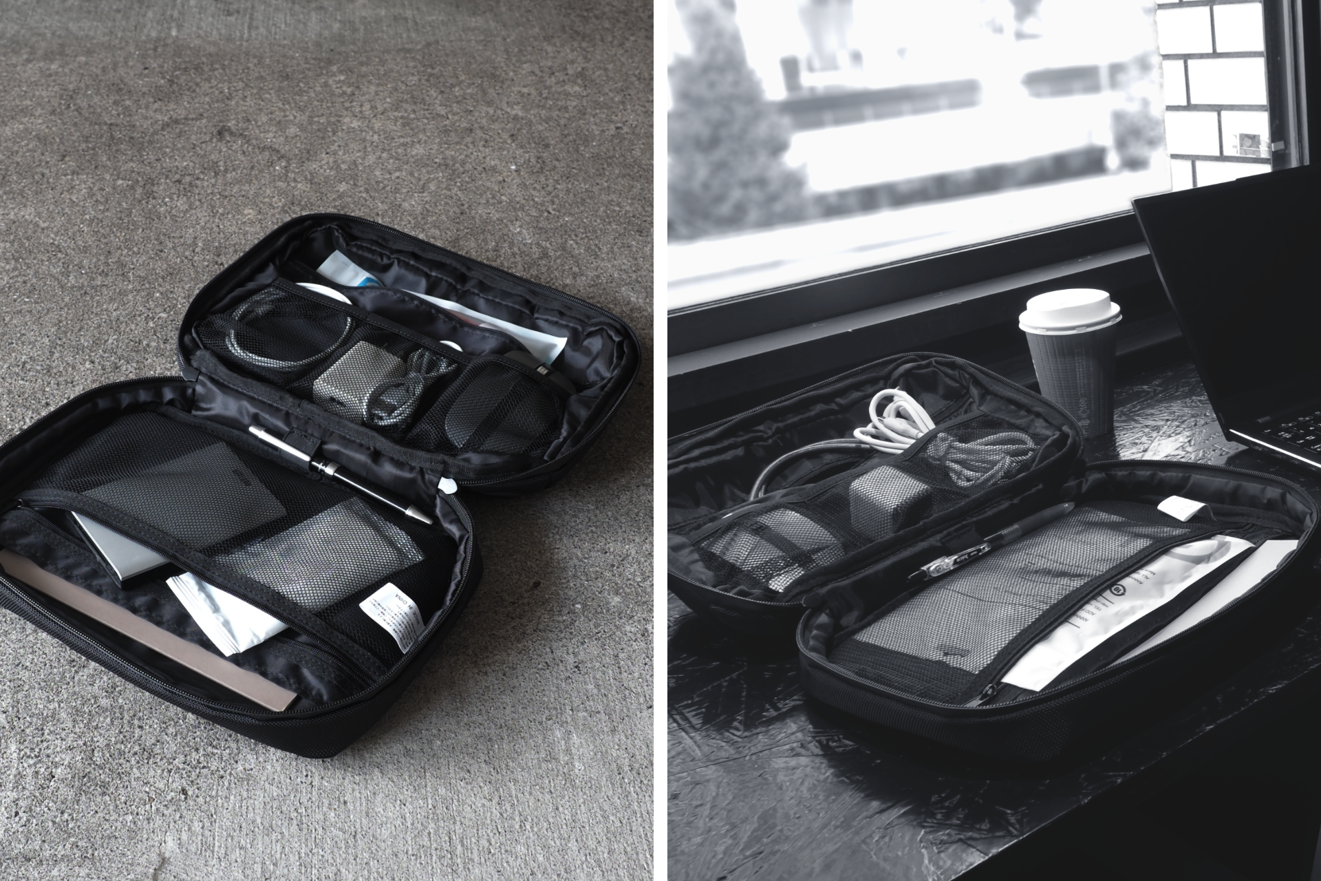 必需品を整理できバッグインバッグとして活躍するアイテム。ケーブル、マウス、バッテリーなどのPC周辺機器に加え、ペンや手帳もすっきり収納できる大容量タイプです。背面にはクッションポケットを備えているので10インチ程度のタブレットを収納することもできます。