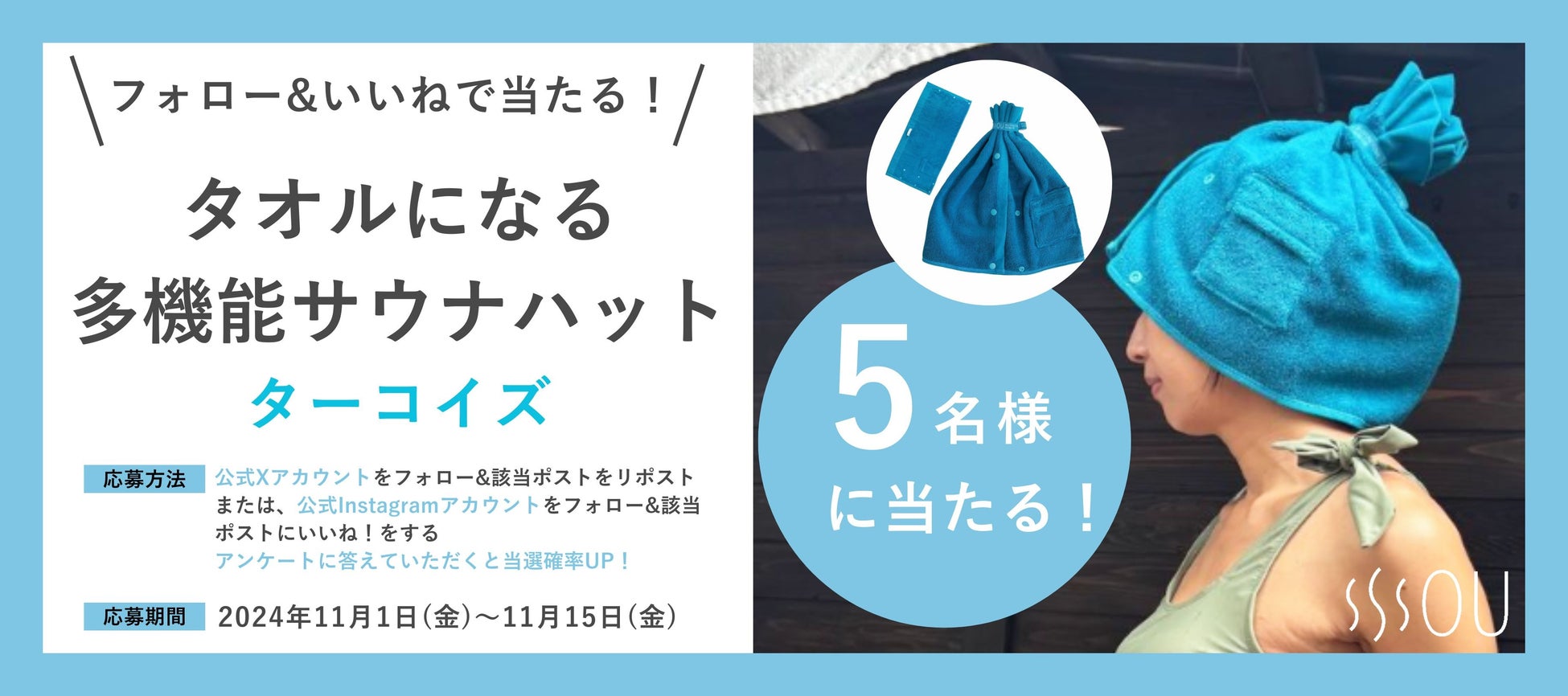 公式Xアカウントと公式Instagramアカウントをフォロー&キャンペーン投稿をリポスト+アンケート回答いただいた方の中から抽選で5名の方にサウナハット(ターコイズ)をプレゼントします。