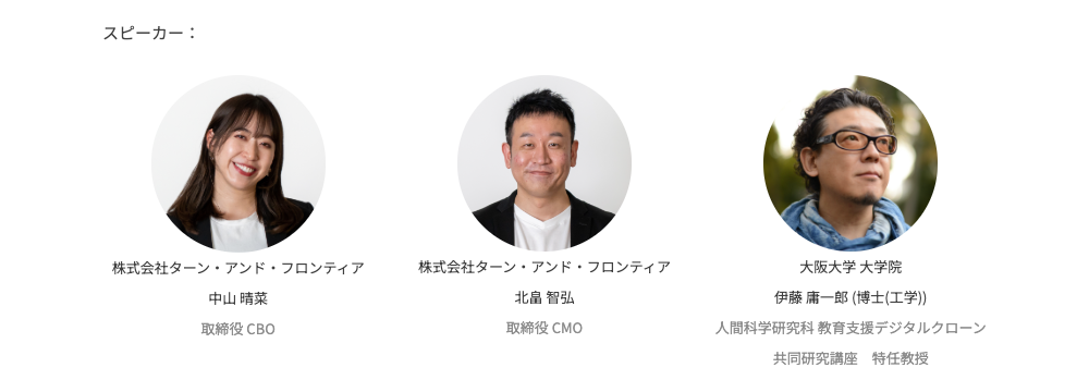 スピーカー: 当社取締役 CBO 中山 晴菜、取締役 CMO 北畠 智弘、大阪大学特任教授 伊藤 庸一郎