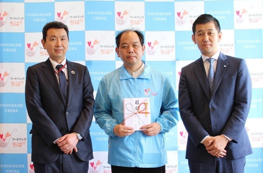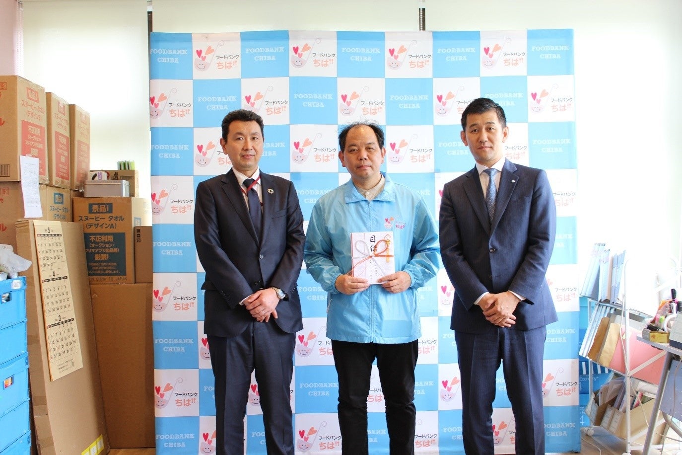 【寄贈式の様子 フードバンクちば代表 菊地様(中央)、千葉興業銀行 古川様(左)、当社取締役 亘(右)】