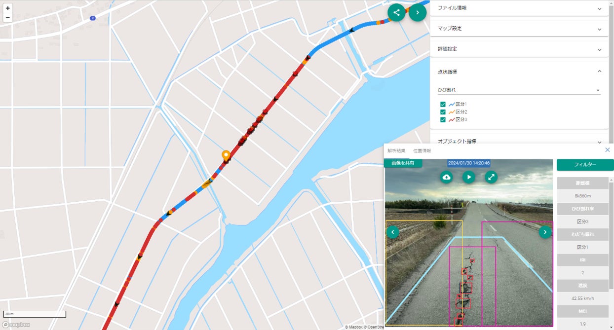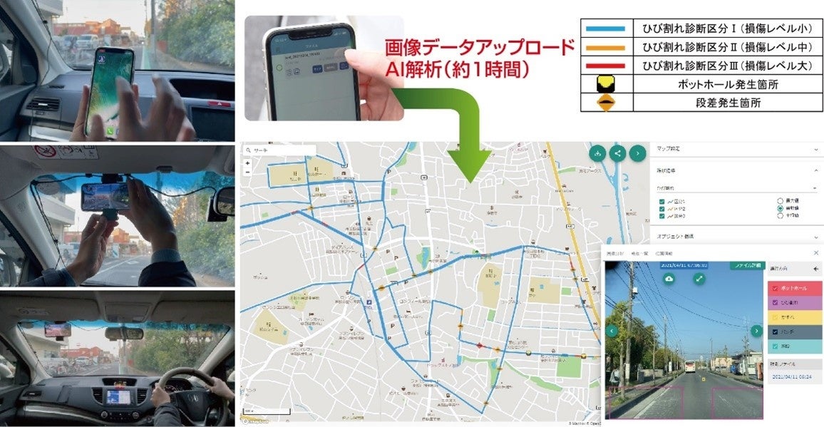 GLOCAL-EYEZは、一般車に取り付けたスマートフォンで道路を撮影し、AIにより舗装路面の亀裂、ポットホールや段差などの損傷状態、道路付属物の傾き、ならびに区画線の擦れ等の位置を簡単かつ迅速に把握・診断することができるクラウドシステムです。本システムは東京大学大学院工学系研究科長山智則教授の開発したAIによる路面評価技術の基本ロジックと株式会社スマートシティ技術研究所のAI・システム開発、ニチレキ株式会社の舗装管理・舗装補修技術を融合することにより開発されました。