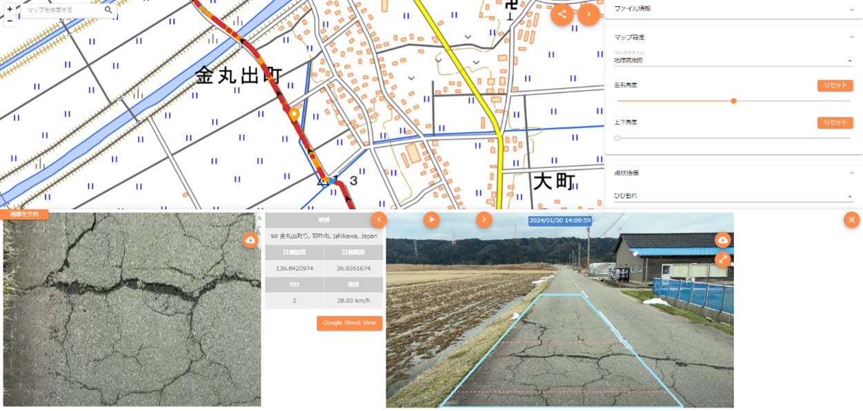 今回の地震においては、道路状況をいち早く確認したい道路管理者様に対して、スマートフォンで取得した路面の状況(路面亀裂、路面陥没、マンホール隆起)、道路沿道の倒木や法面崩壊などの画像データを迅速にご提供しております。今後とも、インフラメンテナンス業界におけるDXの推進を目指す企業として、1日も早い被災地復興のために、地震被害からの速やかな情報収集、復旧に微力ながら貢献してまいりたいと思います。