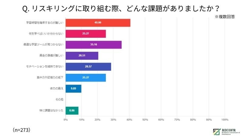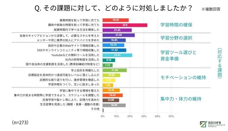 リスキリングに取り組む上で、最も多かった課題は「学習時間を確保するのが難しい(40.7%)」でした。対処法として「趣味や娯楽の時間を削って学習に充てた」と答えた方が多く、他にも「就業時間内で学べる方法を模索した」など工夫が見られました。