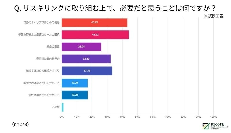リスキリングに取り組む上で必要だと思うことは「学習分野および最適なツールの選択(44.3%)」と「自身のキャリアプランの明確化(43.2%)」、この2つの回答割合が非常に高くなりました。