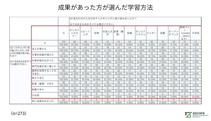 フリーランスは、企業に勤める会社員以上に、自身で学ぶ領域を見極め、主体的に動き、適切なアプローチで効率的にリスキリングを実践する力を身につける必要があります。今回の調査では、フリーランス・副業・複業人材でリスキリングを実施している人の割合は1/4に留まる一方で、成果を挙げている方が90%以上を占める結果が出ています。