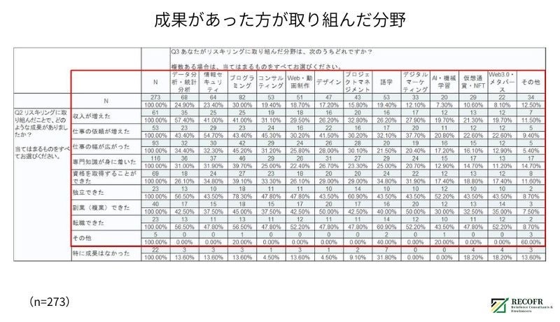 実際にリスキリングが「成果につながった」と回答したフリーランスは、「プログラミング」「データ分析・統計分析」「情報セキュリティ」の3つの分野に取り組んでいる割合が高いという分析結果が得られました。中でも「プログラミング」は、専門知識の習得により仕事の幅が広がったと回答した方が多く、「データ分析・統計分析」はダイレクトに収入増加につながった方が最も多い分野でした。