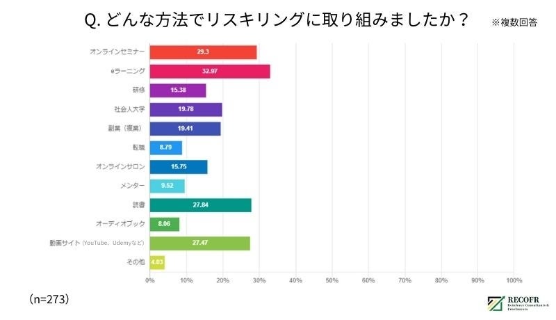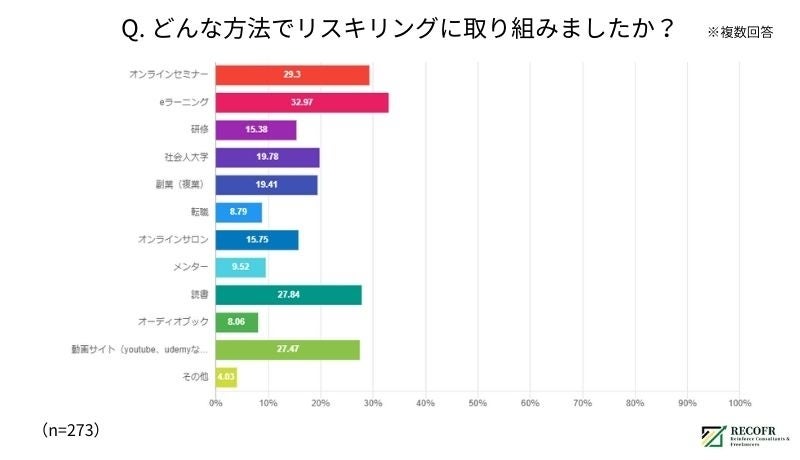 リスキリングに取り組んだ方法は、「eラーニング」「オンラインセミナー」「読書」「動画サイト(YouTube / Udemyなど)」を挙げたフリーランスが大半を占める結果となりました。