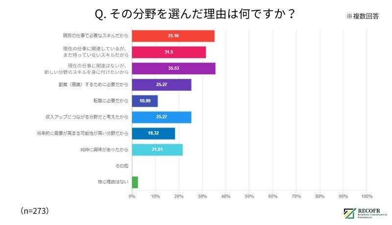 上記の学習分野を選んだ理由としては、「現在の仕事で必要なスキルだから(35.2%)」と「仕事に関連しているが、まだ持ってないスキルだから(31.5%)」を挙げた方が多く、現行業務での必要性が高いほど、意欲的な学びにつながることが示唆されています。