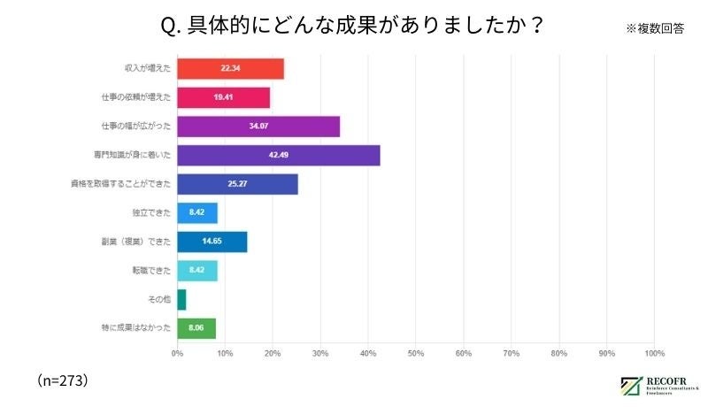 具体的な成果内容は「専門知識が身に着いた(42.5%)」、「仕事の幅が広がった(34.1%)」、「資格を取得できた(25.3%)」、「収入が増えた(22.3%)」などが挙げられています。この結果から、リスキリングはスキル獲得や金銭的リターンの両方に期待でき、フリーランスとして中長期的に事業を行う上でのメリットが大きいことが分かります。