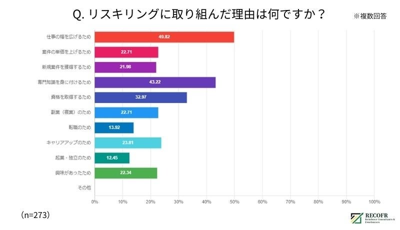 ■ リスキリングに取り組んだ理由の第一位は「仕事の幅を広げるため」、専門知識や資格取得を目標とするフリーランスも多数