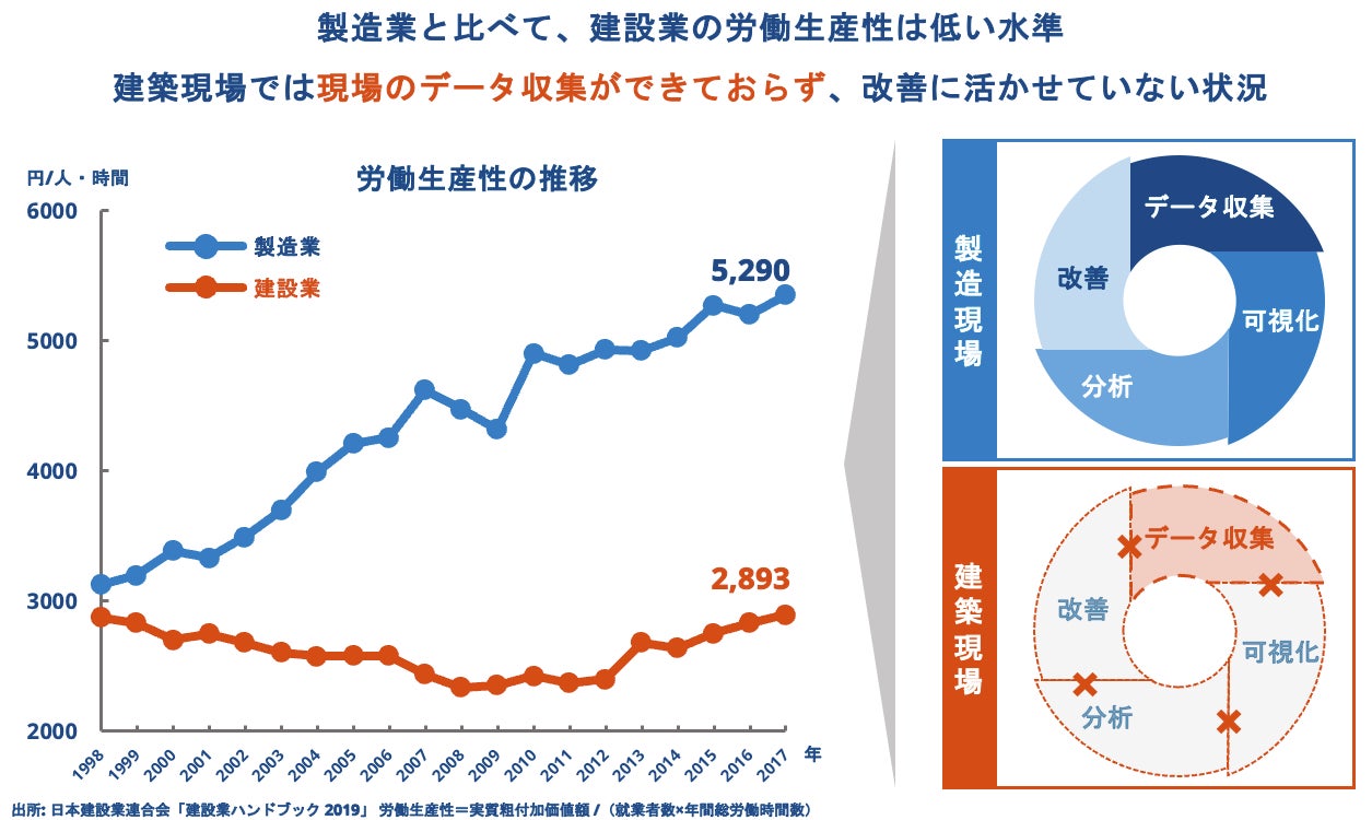 建設業はその労働生産性が製造業に比べ大幅に低い水準で推移*しております。この原因の1つとして、製造業ではIoT/AI技術により「データ収集→可視化→分析→改善」という生産性の改善サイクルが回っていますが、建設業では最初の「データ収集」のステップでつまずきデータ駆動の生産性改善ができていないことが挙げられます。