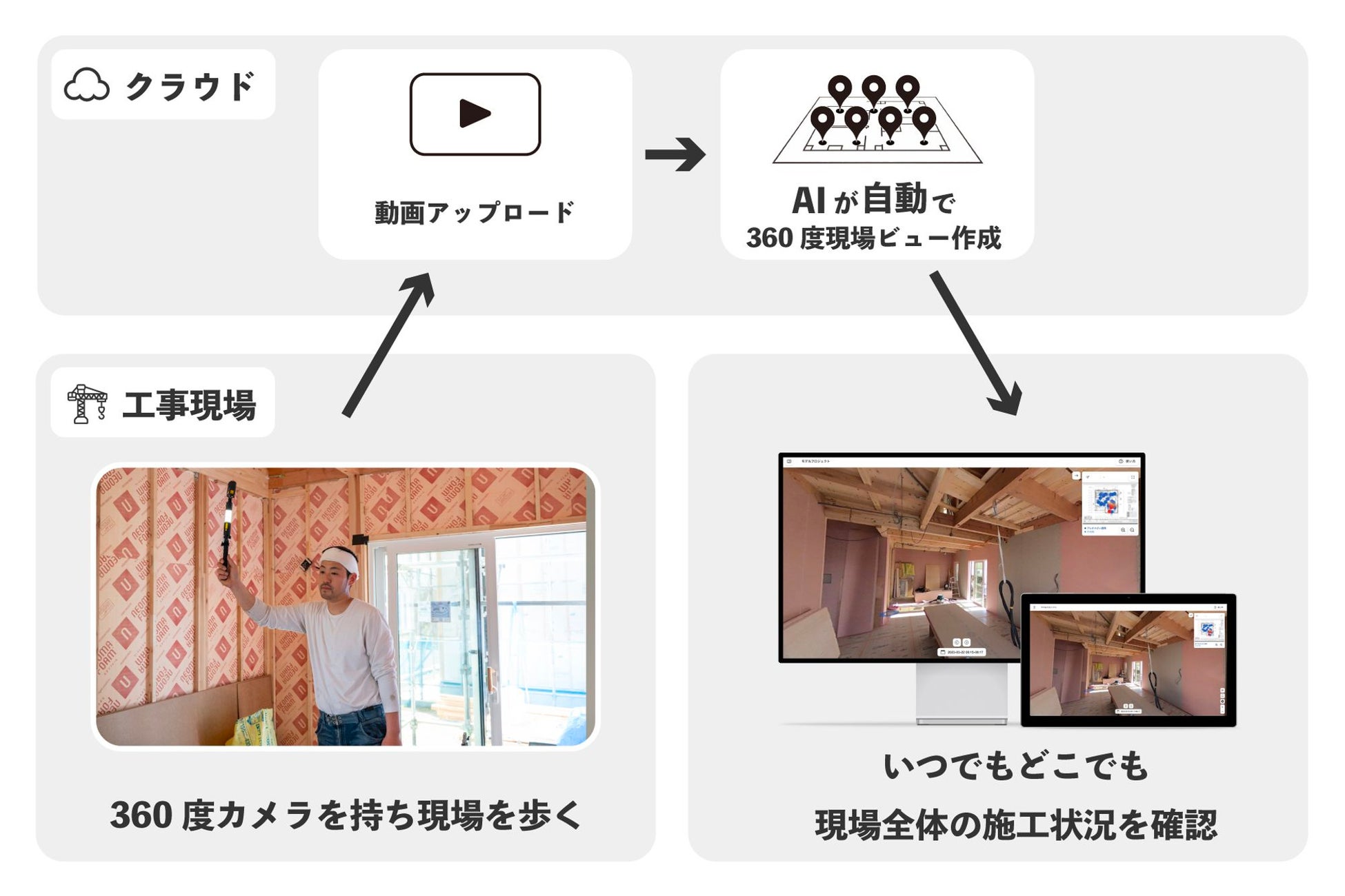 「zenshot」は、カメラを持って建築現場を歩くだけで画像処理AIが360度現場ビューを自動で作成するクラウド型サービスです。ITに慣れていない方でも操作できるよう、データの取得を徹底的に簡便化。クラウドにアップロードされた360度動画像をもとに、AI/画像処理技術で撮影ルートを分析し、図面と整合。ユーザーは、図面に自動配置されたポイントをクリックするだけで現場各所の360度画像を見ることができ、遠隔確認や隠蔽部を含めた網羅的な現場記録を可能にします。