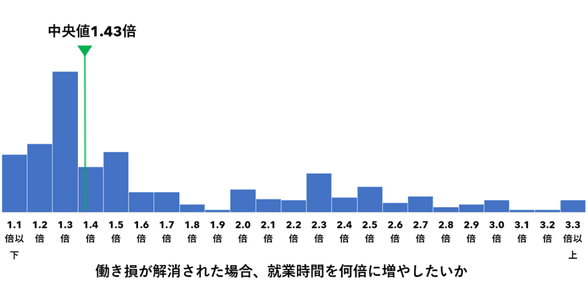 ここまで有配偶パート女性の就業についての意向や希望を探ってきましたが、視点を変えて、今回の結果が雇用企業側の人材不足解消にどのように貢献するかを考えるため、「働き損が発生しない場合の希望月間勤務時間」が、その回答者の「現在の月間平均勤務時間」の何倍になるのかを試算したところ、中央値は1.43倍となりました。