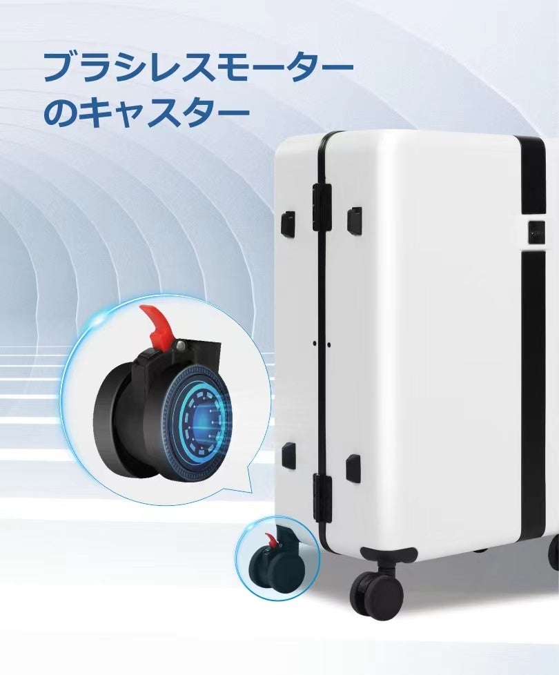 一見、フツーのスーツケースに見えるコチラ。実はアシスト機能を搭載した日本初のアシスト機能付きのスーツーケースなんです。モータードライバIC、ブラシレスモーターをキャスター内に内蔵することで、アシスト機能を実現。アシスト機能付き自転車よろしく、少し押したり引いたりするだけでグーンっとスーツケースが進み、力の弱い小さい子やお年寄りでも重い荷物を楽~に運ぶことが可能です。