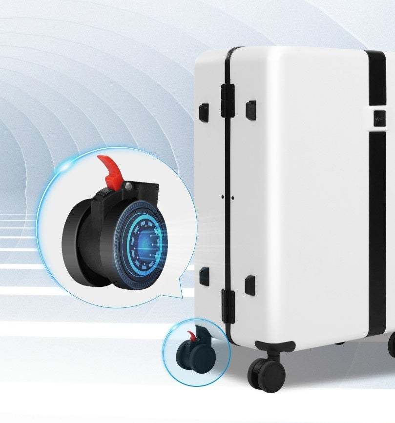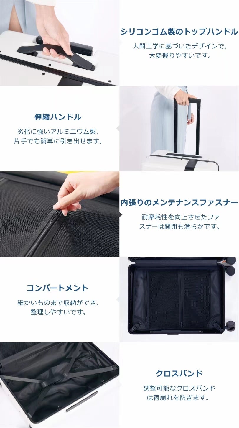 MOOBOTはスマートアシスト機能だけではなく、スマホの充電機能、静音キャスター、TASロックも装備しています。スーツケース本体は、ドイツのバイエル社製のポリカーボネートを使用し、丈夫さと耐衝撃性に優れています。今回2つのサイズを展開しております。Sサイズ(機内持ち込み可)とMサイズ(無料手荷物許容量)。