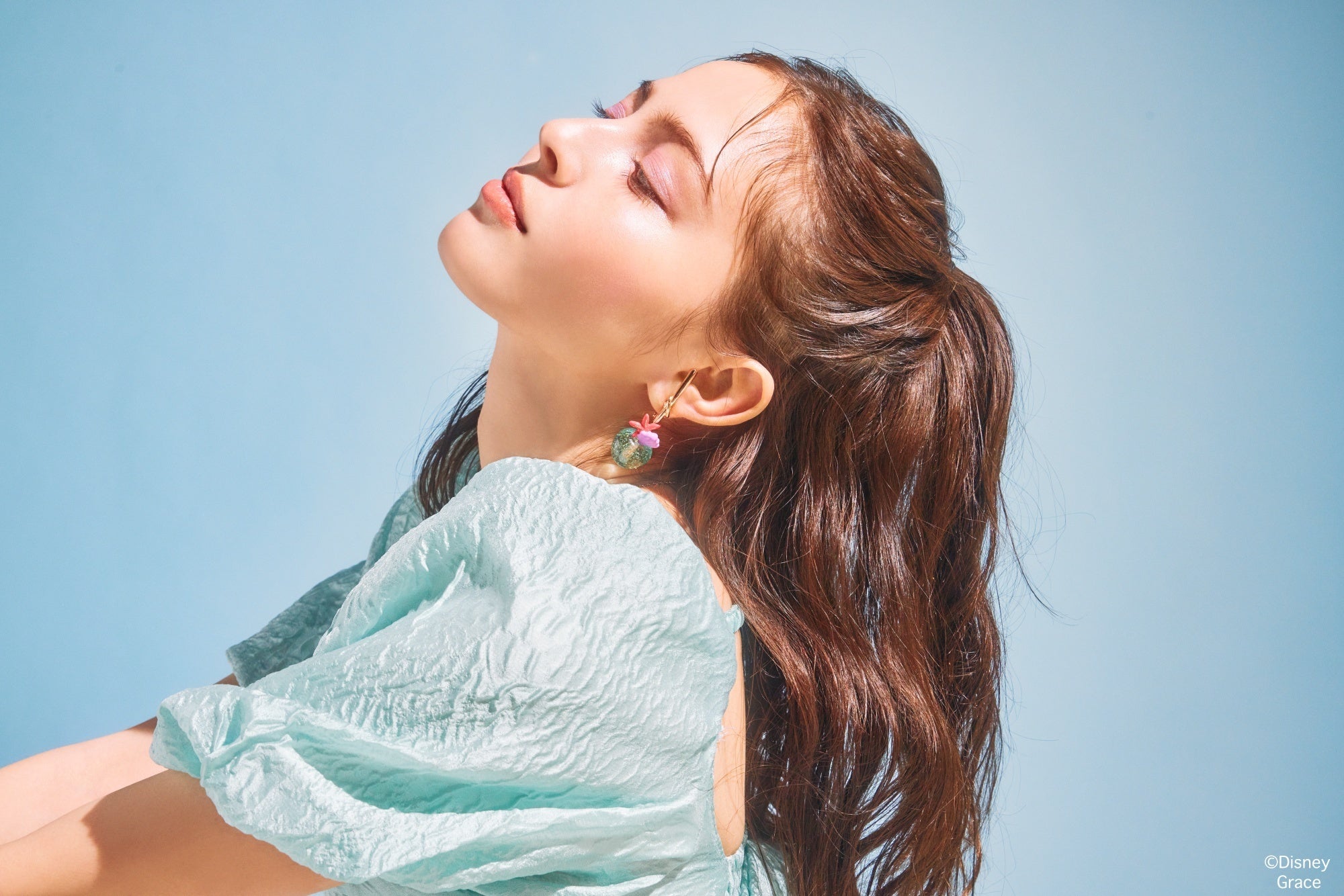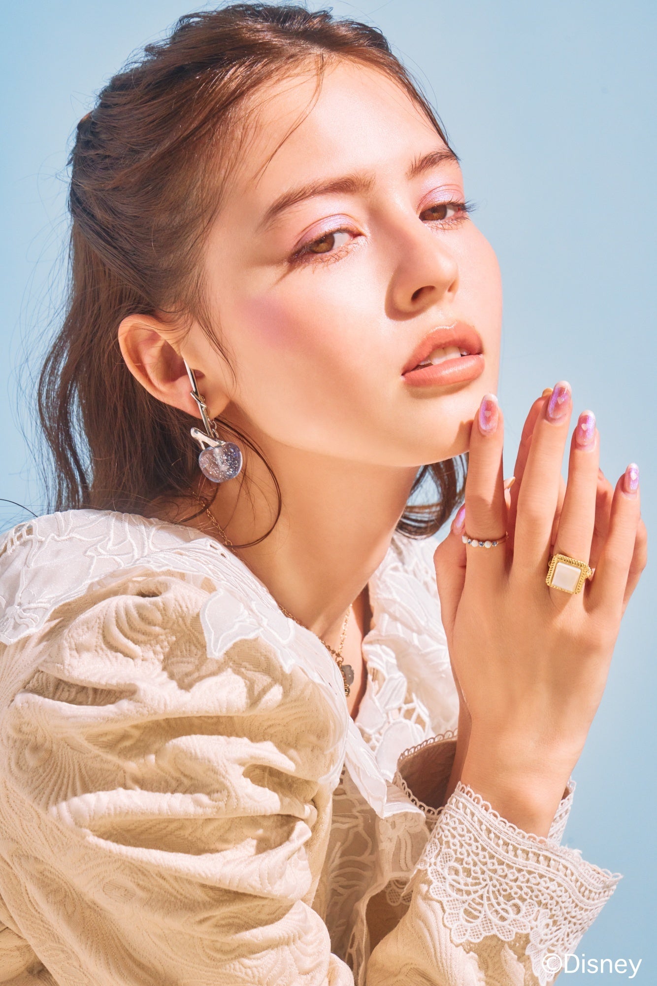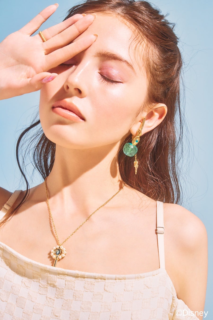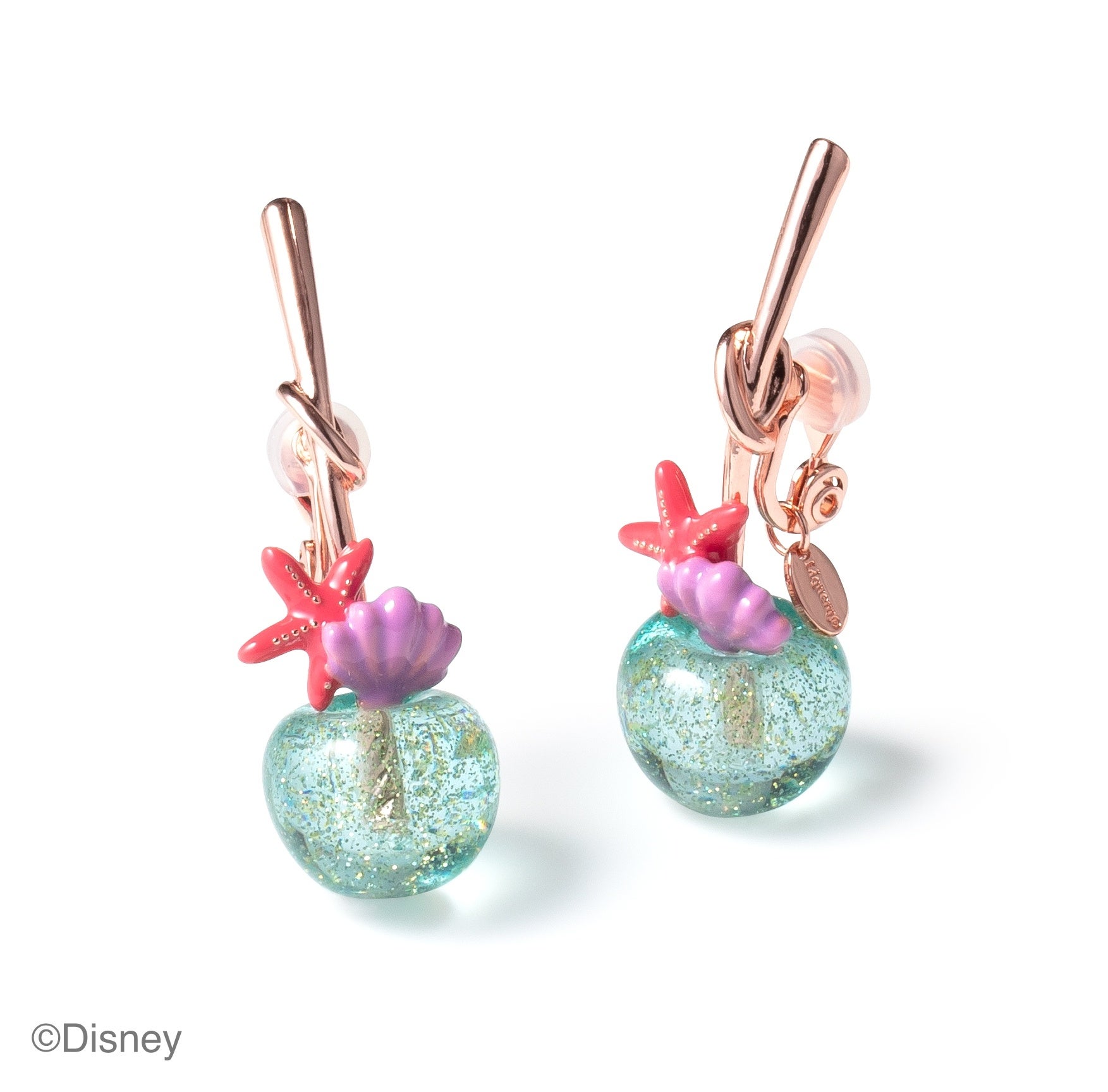 実は、アリエルのフィンを連想させるラグーンカラー。中に入れたオーロララメは、色とりどりな珊瑚礁のよう。柄には、ヒトデとシェルのモチーフをトッピング。ピンクゴールドメッキで、アリエルのヘアカラーをイメージしています。