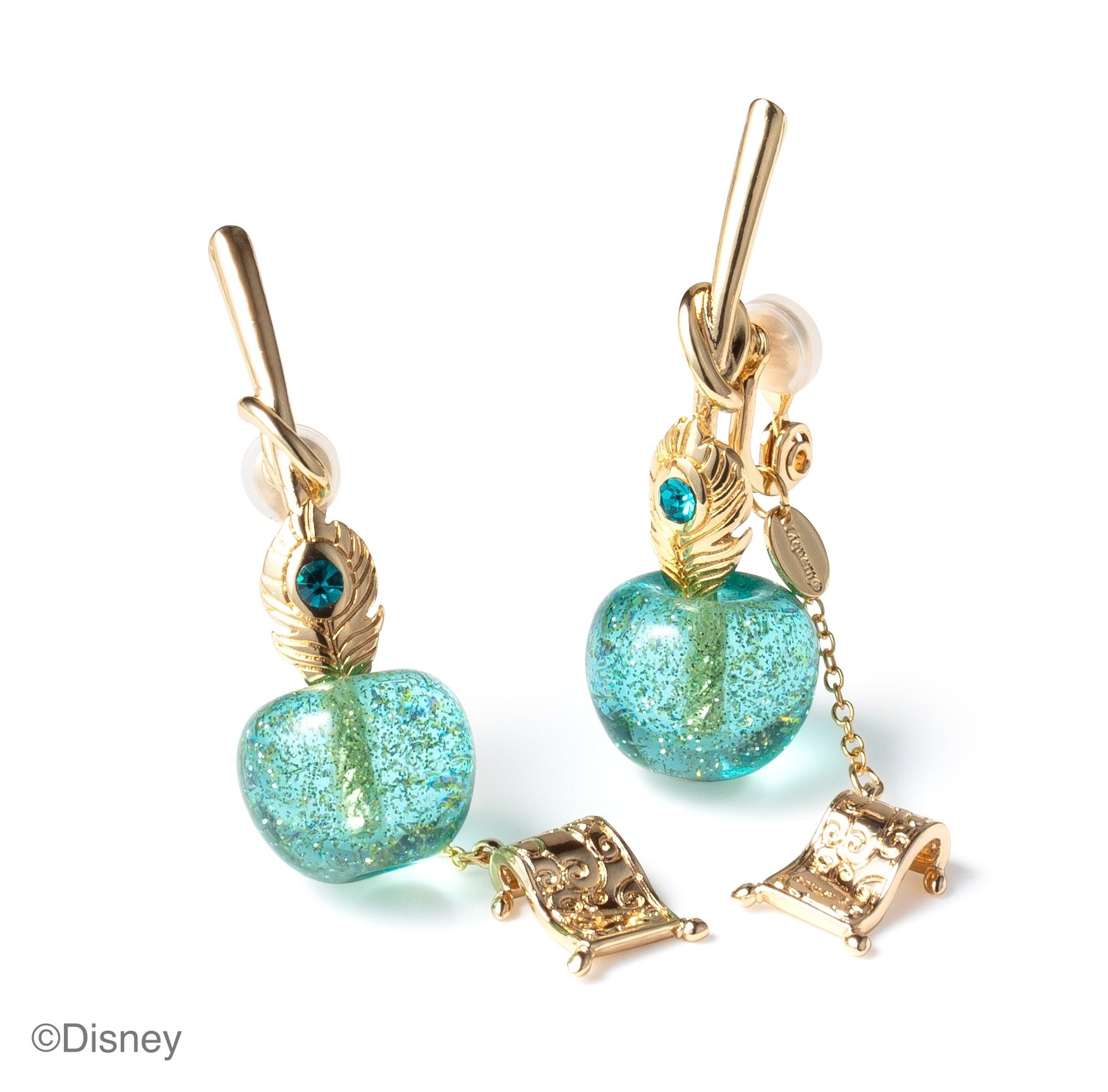 オリエンタルな羽には、ジャスミンが身につけている宝石をイメージしたガラス付き。ピアス/イヤリングの金具には、今にも飛び出しそうな魔法のじゅうたんが付き、耳元で揺れる仕様です。