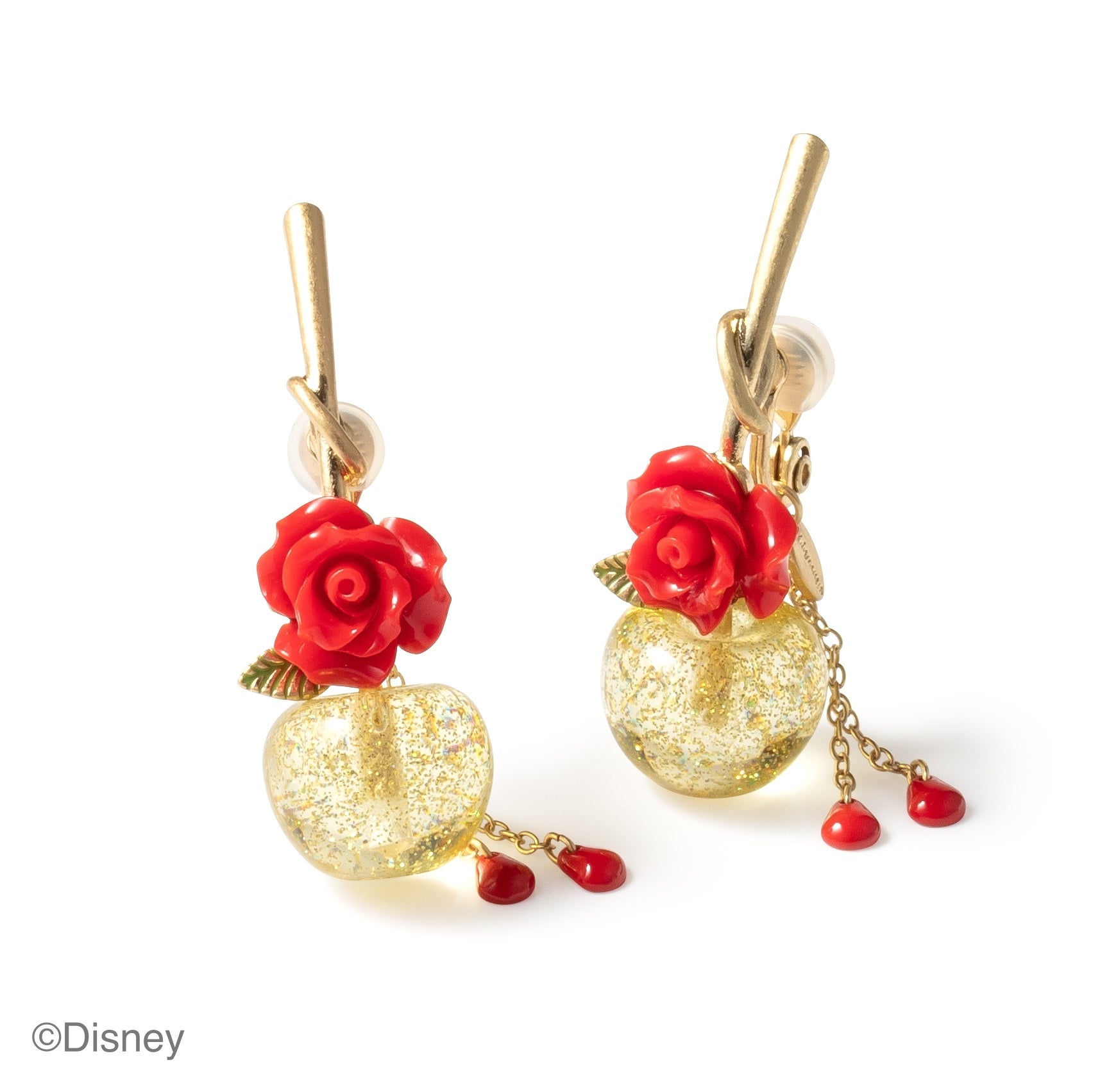 ベルのドレスを彷彿させるイエローの実と、物語のキーでもある魔法のバラを組み合わせ。枯れゆくバラをイメージして、ピアス/イヤリングの金具からは2枚ずつ花びらが揺れるロマンチックな仕様です。メッキは古代金カラー。野獣とベルが暮らす重厚感あるお城をイメージしています。