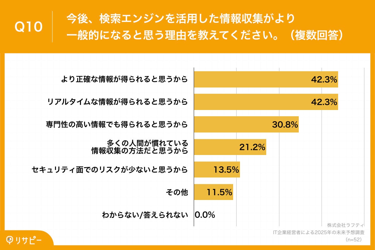 Q8で「検索エンジンがメインで、一部ChatGPTなどのAIを使う」「検索エンジンしか使わない」と回答した方に、「Q10.今後、検索エンジンを活用した情報収集がより一般的になると思う理由を教えてください。(複数回答)」(n=52)と質問したところ、「より正確な情報が得られると思うから」が42.3%、「リアルタイムな情報が得られると思うから」が42.3%、「専門性の高い情報でも得られると思うから」が30.8%という回答となりました。