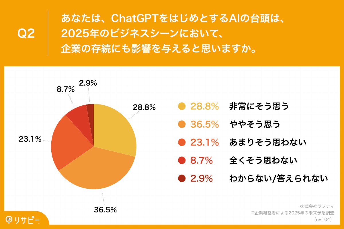 「Q2.あなたは、ChatGPTをはじめとするAIの台頭は、2025年のビジネスシーンにおいて、企業の存続にも影響を与えると思いますか。」(n=104)と質問したところ、「非常にそう思う」が28.8%、「ややそう思う」が36.5%という回答となりました。
