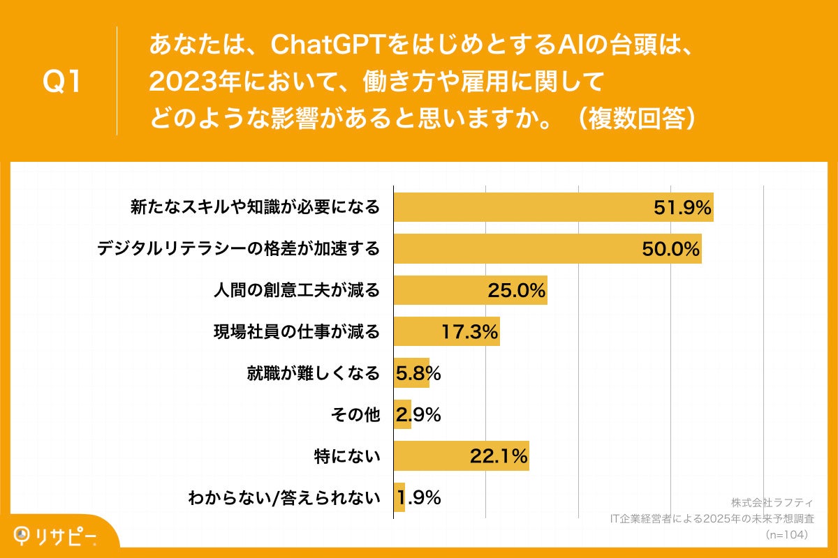 「Q1.あなたは、ChatGPTをはじめとするAIの台頭は、2023年において、働き方や雇用に関してどのような影響があると思いますか。(複数回答)」(n=104)と質問したところ、「新たなスキルや知識が必要になる」が51.9%、「デジタルリテラシーの格差が加速する」が50.0%、「人間の創意工夫が減る」が25.0%という回答となりました。