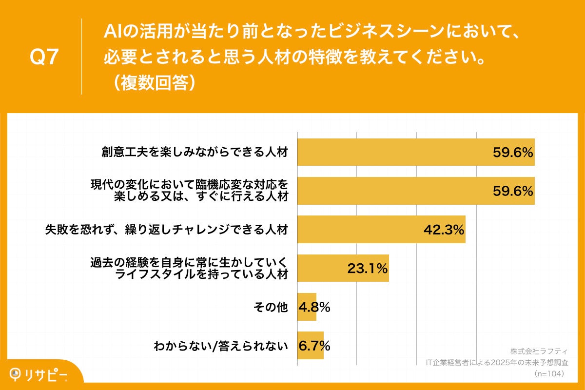 「Q7.AIの活用が当たり前となったビジネスシーンにおいて、必要とされると思う人材の特徴を教えてください。(複数回答)」(n=104)と質問したところ、「創意工夫を楽しみながらできる人材」が59.6%、「現代の変化において臨機応変な対応を楽しめる又は、すぐに行える人材」が59.6%、「失敗を恐れず、繰り返しチャレンジできる人材」が42.3%という回答となりました。
