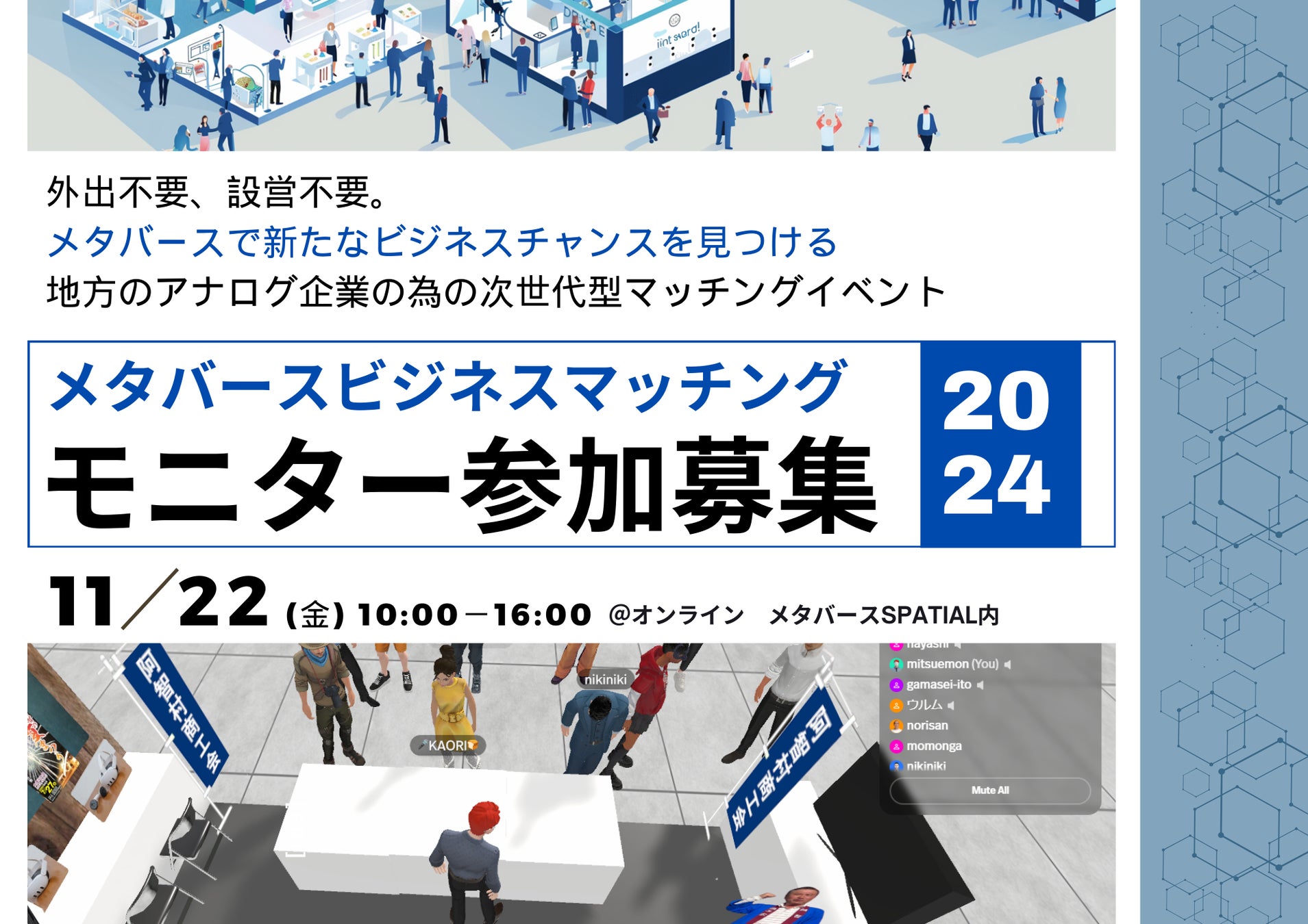 地方の中小企業は今、人手不足や原材料費の高騰といった深刻な課題に直面しています。このような状況下で、これまでのビジネスモデルや人材との接点を変革することが急務です。そんな中、メタバースは単なる仮想空間の枠を超え、企業にとって新しい商流や多様な人材との出会いを生み出す、かけがえのないチャンスとなり得ます。私たち運営チームは、地方の企業がこれまでアクセスできなかった広がる市場やつながりを、メタバースを通じて手に入れ、次世代のビジネスを切り開いてほしいということです。この社会実験に参加していただくことで、企業が自らの成長機会を見つけるだけでなく、日本全体の地域経済の活性化に貢献できると確信しています。これまでにない方法で新しい未来をともに創り上げるため、この挑戦にどうかご参加ください。