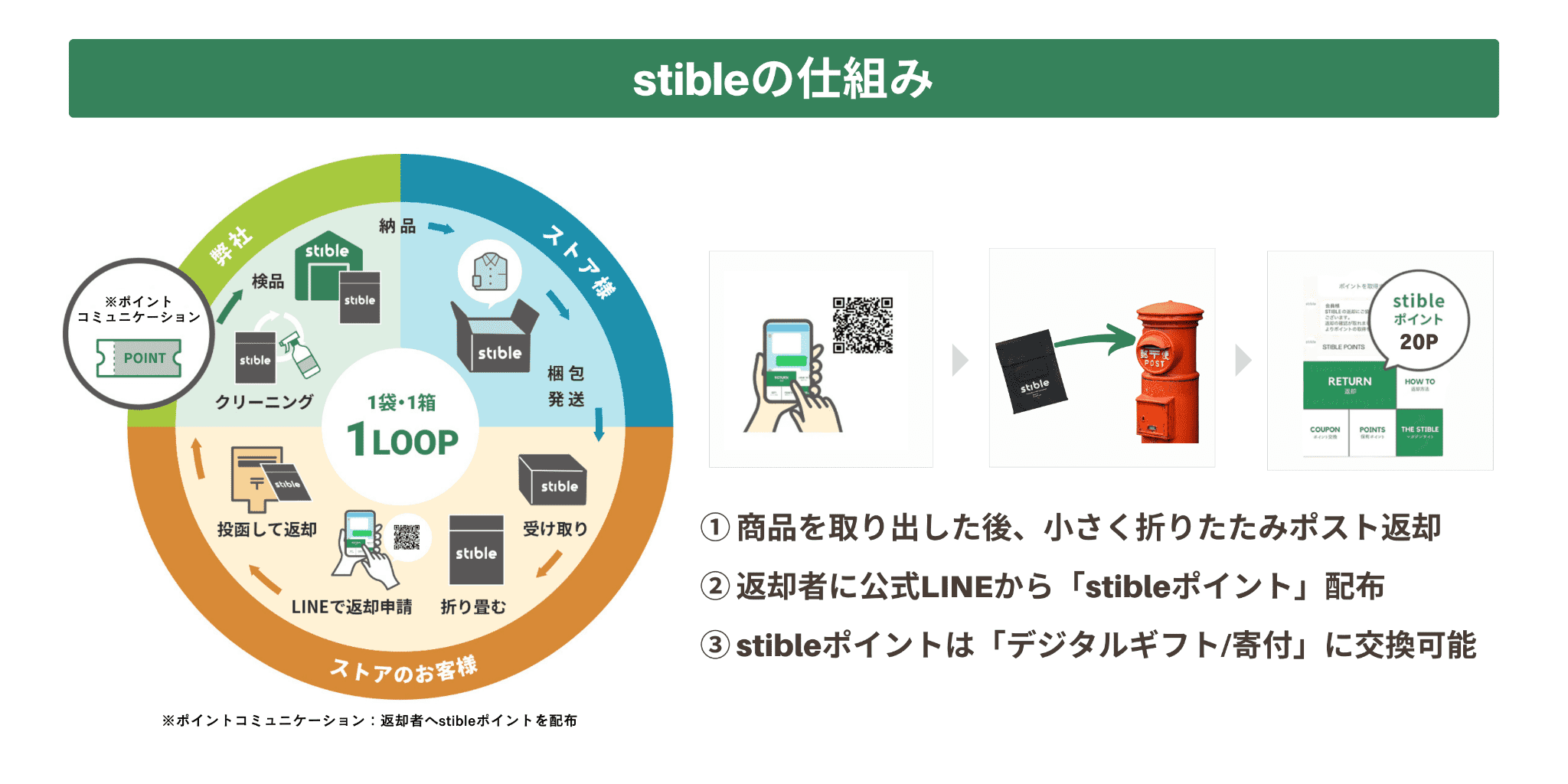 ②返却者には「stibleポイント」をstible公式LINEから配布。