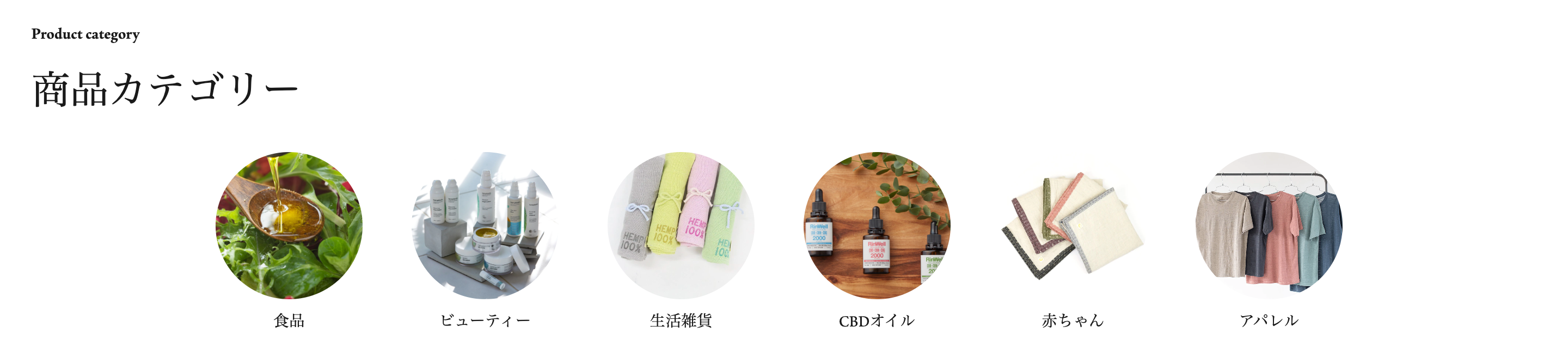 「食品 / ビューティー / フェムケア / 生活雑貨 / CBDオイル / アパレル / 赤ちゃん / 書籍」の幅広いラインナップ展開!(CBD製品は全て成分表 (COA)取得商品のみをお取り扱い)