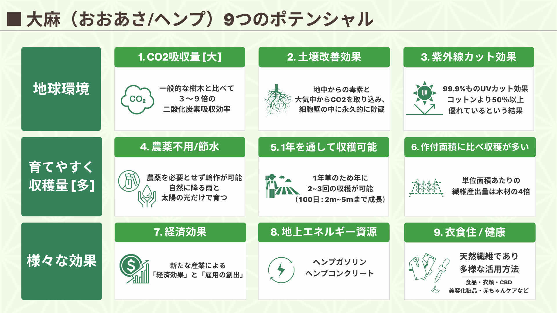 麻を育て共に生活することで、「地球温暖化の改善」「土壌汚染の改善」「農薬不使用/節水」「資源の節約」「食糧危機問題の解決」「衣食住/健康への恩恵」「経済効果と雇用創出」など、多くの恩恵を受け、地球と私たちを導いてくれます。