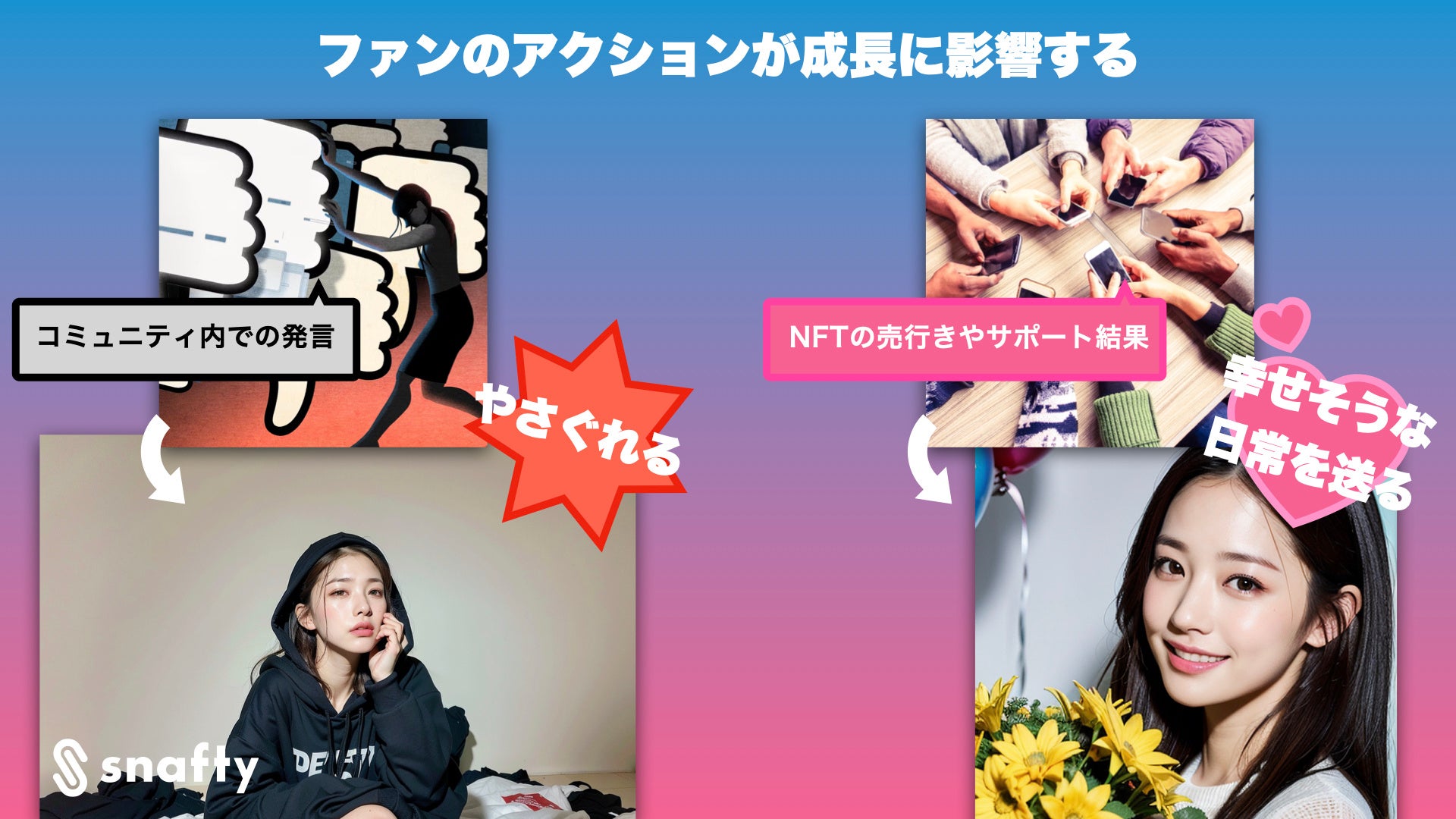 SNAFTYは、ブロックチェーンとAIで、喜びや感動を分かちあえる世界をつくるをビジョンに、ファン、タレント、クリエーター、企業がブロックチェーンで繋がり、共に成長し喜びを分かちあえる世界の創造を目指し続けます。