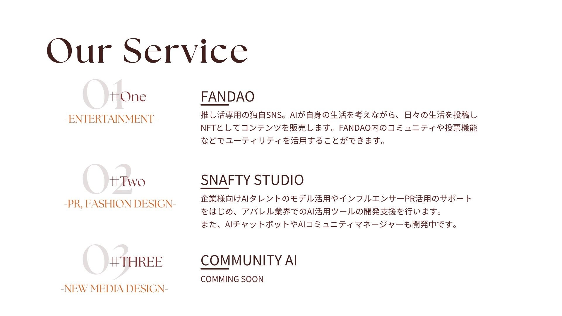 企業様とのコラボレーションやオーディション企画を行い、バラエティ豊かなAIタレントが随時デビュー予定です。今後は、感情を持った音声での対話も実装予定ですので、各アカウントをフォローしてお待ちください!