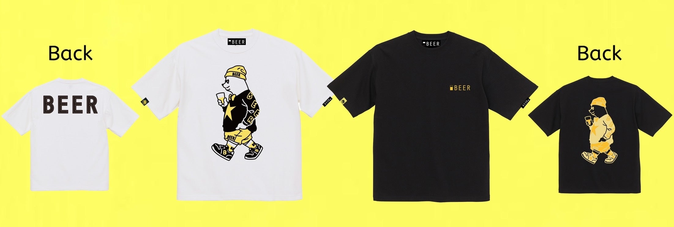 クールなブラック地に、黄色の洗練されたBEERのロゴデザイン。バックにはビアっくまが描かれ、