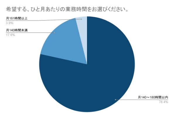希望する業務時間は月に140〜180時間と、現在の業務時間と希望する業務時間が乖離したのは全体の17.6%でした。乖離した17.6%のうち、75%は、今よりも少ない勤務時間を希望していることが分かりました。