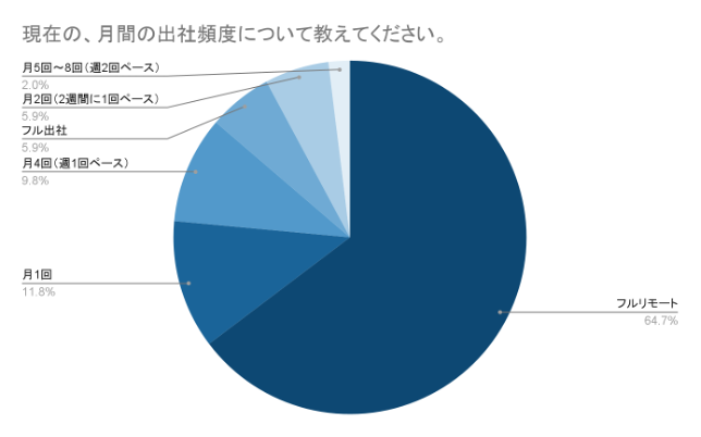 月の出社頻度はフルリモートが64.7%で最も多く、次いで月1回が11.8%、週1回が9.8%と3番目に多い結果でした。