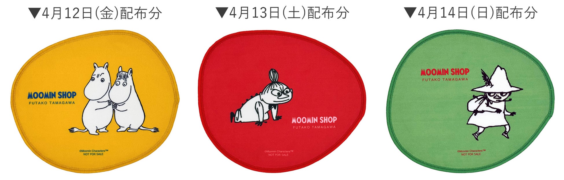 4月12日(金)・13日(土)・14日(日)の3日間、ムーミンショップ フタコタマガワにて商品を税込5,500円以上ご購入いただいた方、各日先着200名様に、オリジナルタオルハンカチをプレゼントいたします。