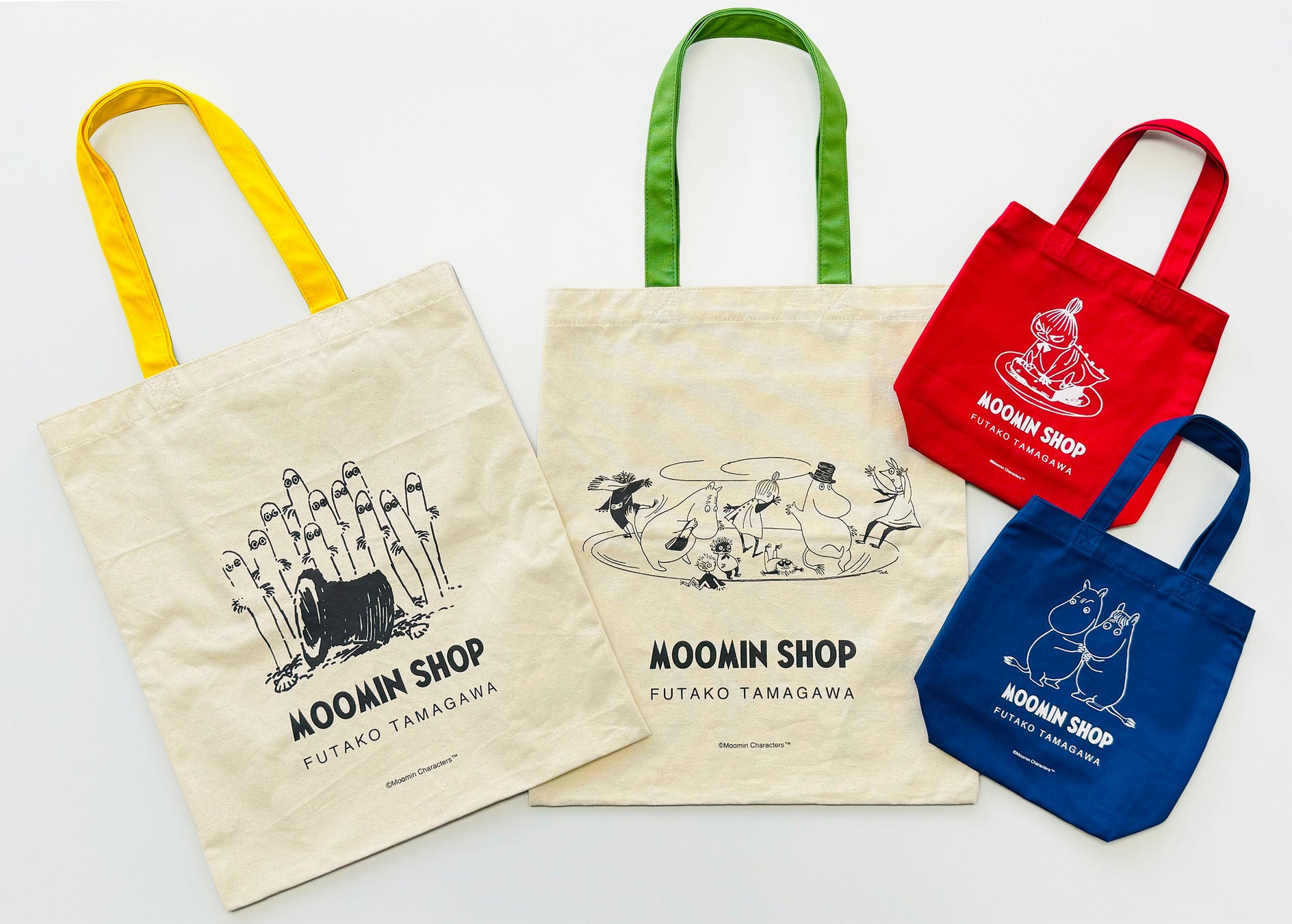 店舗限定品として毎回大人気のムーミンショップ ロゴ入りトートバッグ。キャンバスを彩るクレヨンのような、あざやかな色が目を引きます。二子玉川店では、定番サイズに加え、初となるミニバッグもご用意しました。