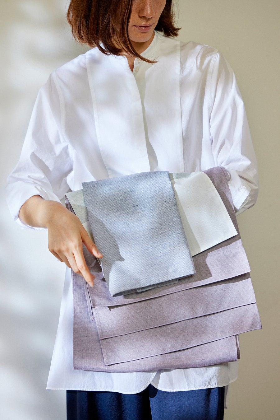 セカンドコレクションのインスピレーションとして着目したのは、南ヨーロッパに多くみられる陶器の淡く繊細な色使い。絶妙な優しい色合いのグリーンやパープル、そして明け方の北大西洋のような褪せたブルー。これらの色みを独自開発したリサイクル糸の新色で紡ぎ、クロスたちに生まれ変わりました。eterbleのオリジナル生地「eterble fabric」は多くの人々が歓喜するシーンを見守り、祝福してきた布たちを廃棄せずに再生させ、新しい日常へと紡いだものです。原材料は、結婚式場やパーティー会場、一流ホテルなどにお貸し出ししてきた自社のレンタルテーブルクロスたちです。使い込まれてレンタルできなくなったクロスを色ごとに分類、裁断し、反毛し紡績、織り、縫製して新たなテーブルウェアとして生まれ変わらせました。新色のeterble fabricは存在感がありながらもやさしい色と風合いで、より日常の食卓に馴染みやすい生地感となりました。